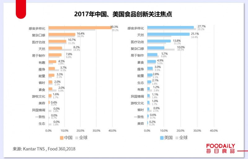 市场研究机构KantarTNS日前发布了2017年中国和美国食品创新关注点的统计结果。在全部15个选项中,感官多样性、复杂性、医药功效、天然和容易制作和食用这5项排名靠前。中国和美国表现出了一致性。但在具体位次和关注程度上则有所区别。总体来说,中国更偏重口感,而美国追求天然性和具有医药级别的功效。了解这个大背景后,对美国功能食品产业的具体表现也就更容易理解。