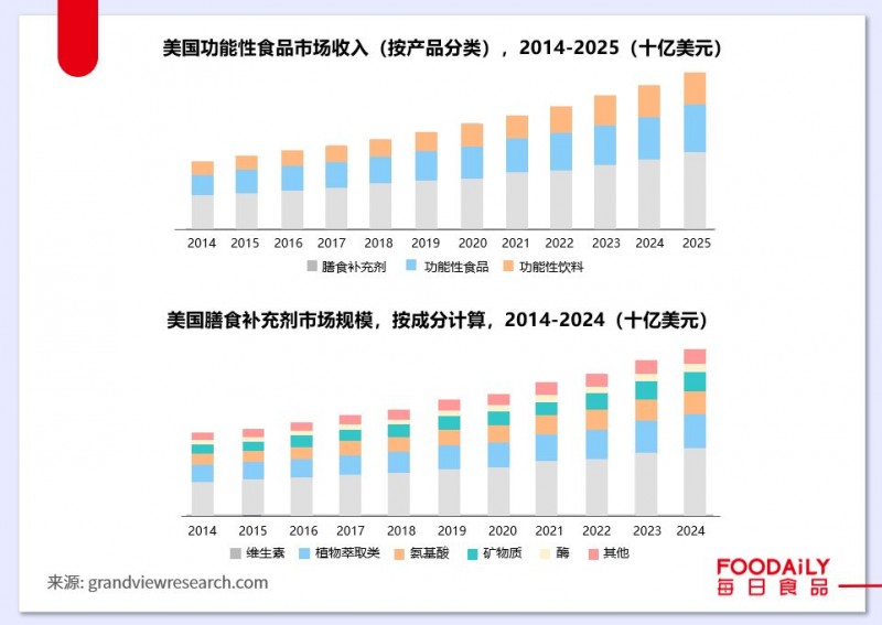 根据Grand ViewResearch对美国功能性食品整体销售额的统计和预测,2015年其销售额大约在630亿美元。到2025年总量将翻倍,年均增长率约为6.5%,高于美国整个包装食品行业5%的年均增速。膳食补充剂是整个市场中占比最大的类型,其占比基本稳定在50%。功能性饮料相对增速较快。