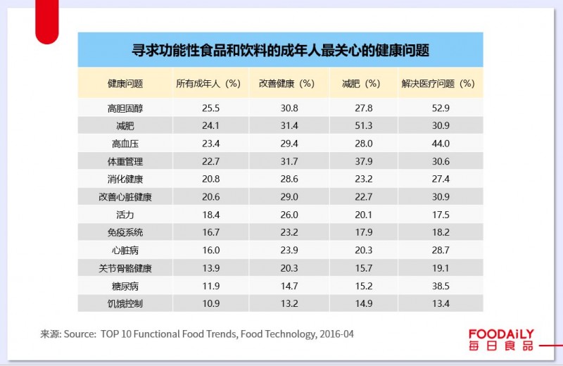 来自《PackagedFacts》的一项消费者调查将功能食品消费者分为普通成年人、改善健康需求者、体重管理者和医疗目的者四类。将这四类人群最看中的12项功能诉求列出,排名前5位的诉求分别为高胆固醇、体重控制、高血压、体重管理和消化健康。这是四类人群都重点关注的功能,其关注比例均超过20%。