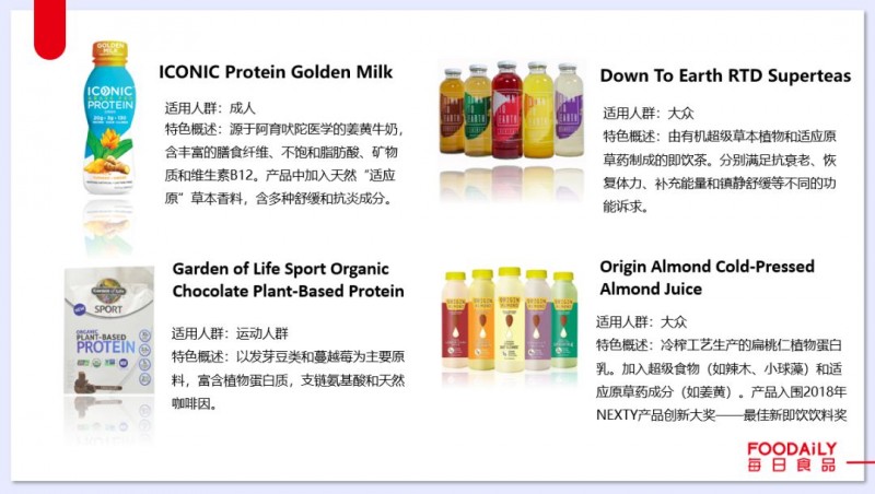 创新产品举例:加入天然“适应原”草本香料的姜黄牛奶、含发芽豆类的蛋白粉,由有机超级草本植物和适应原草药制成的即饮茶,以及加入姜黄的扁桃仁植物蛋白乳。
