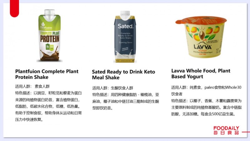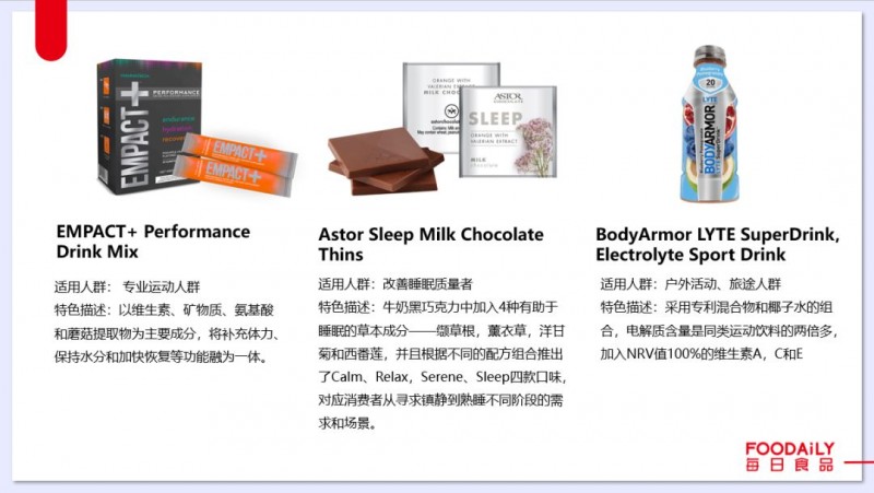 市场上这一类产品相当丰富,如植物蛋白奶昔、生酮型奶昔和植物基酸奶,分别适应素食者、生酮饮食者和原始饮食者的需求;还有针对专业运动人群的蛋白冲饮,户外活动与旅途人群的运动饮料,以及希望改善睡眠质量的人的巧克力等。