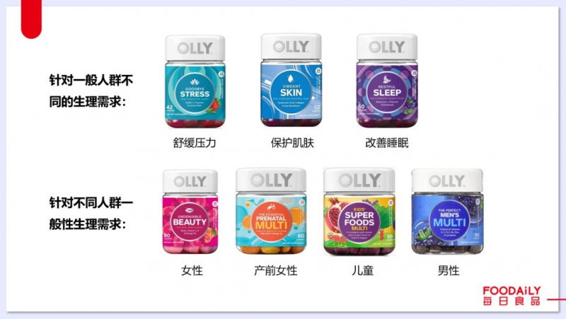 功能食品要想吸引有着更多选择更多想法的消费者,就需要在定位上做到精准。用这组来自OLLY的功能软糖做个例子,其产品从两个维度上设计定位,一个是针对一般人群不同的生理需求,包括舒缓压力、保护肌肤、改善睡眠;另一个是针对不同人群的一般性生理需求,如女性、产前女性、儿童、男性等。