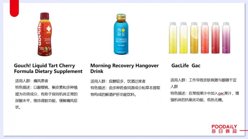 此外还有很多针对特殊的细分人群的产品。如下图三款产品针对痛风患者、酒醉者,以及从事文案工作导致皮肤刺激眼睛干涩的人群,其功效成分主要是果汁和植物提取物。另外三款则瞄准了看电视、电脑过度的儿童,女性运动健身者,以及希望保持健康状态的咖啡嗜好者。