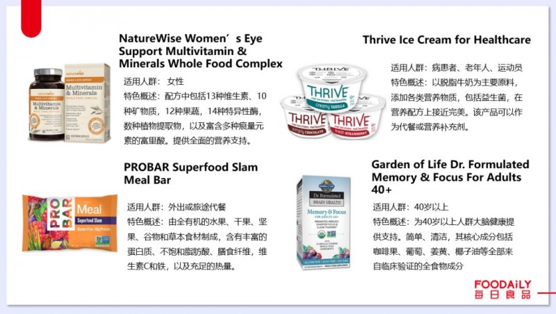 全营养型的产品我们选择了4个例子,分别是适合女性的膳食补充剂、适合外出人群的全食代餐棒、适合运动员、老年人和病患者的全营养冰淇淋,以及适合40岁以上人群的全食物来源的膳食补充剂。