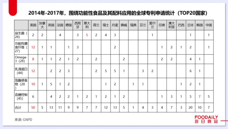 讲到科学对于功能食品产业发展的促进作用,专利申请是一个很好的衡量指标。这些专利体现出行业将研究成果商业化的能力,是一个国家产业发展最根本的竞争力。