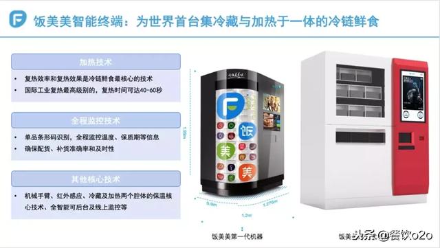 饭美美是一个无人售饭机。布局在企业、交通枢纽、写字楼等场所,每台售饭机一次可放 84 份盒饭。C 端用户通过扫码支付,部分食品机器在 40~60 秒的加热后就可以取出食用了,也有部分无需加热的冷餐。目前已上线 SKU 有 500 多种,包括中餐、日料、色拉、银耳、粥、各种面食等。目前这些 SKU 除了饭美美自营以外,还有合作开发的品牌,包括眉州东坡、真功夫、伏牛堂、乐纯酸奶等。饭美美说未来自营品牌将会减少,主要还是搭建一个平台给其他餐食品牌做销售,之前自营的目的是为了跑通整个闭环。
