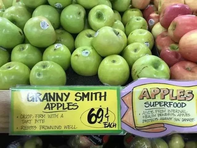 2.水果蔬菜区的标签,还会比较详细的描述味道、口感,适合食用方式,比如苹果,有的很甜脆适合零嘴、有的甜中带酸口感紧实适合做苹果挞等等。