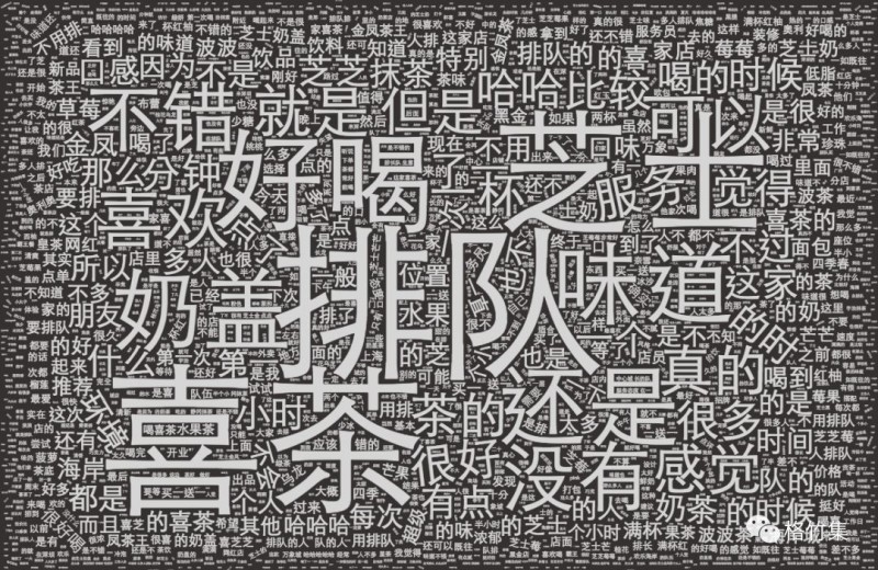 在排除数据里有关口味的评价后,我制成了这张喜茶“分享”词频图。按照口味等产品评价所占的文字比例,51% 的拷贝指南或许是一个不精确但适当的数字。
