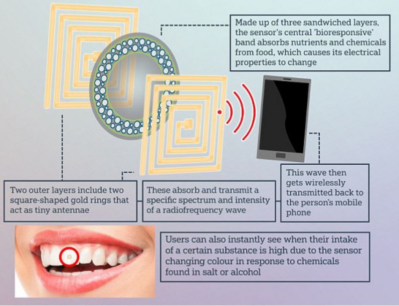 还有一些传感器不需要经过肠胃,例如塔夫茨大学(Tufts University)发明了一种牙齿传感器,大小为2毫米×2毫米,可以检测葡萄糖、糖和酒精的摄入量。