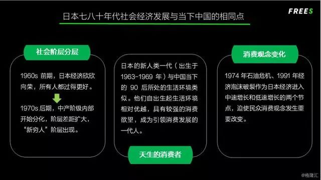 有意思的是,日本七八十年代的年轻人和中国的 90 后非常类似。他们出生于国家经济高速增长的中间时期,自出生起生活环境相对优越。因此,他们有较强的消费欲望,在消费上更加大胆,也更加追求个性化。