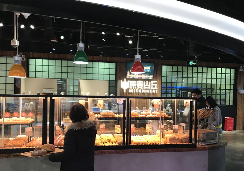 在盒马鲜生十里堡店,原麦山丘的门店距离进门不到50米,面积约有270平米,靠近海鲜销售区。