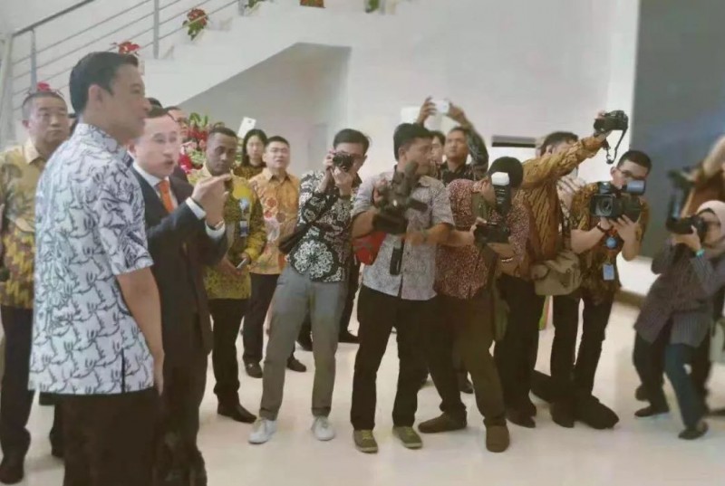 卢敏放向印尼投资协调委员会主席ThomasLembong介绍工厂情况,当地媒体高度关注