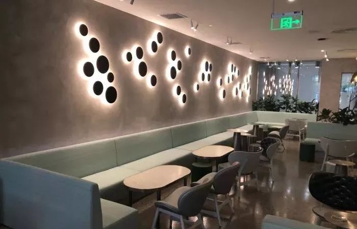 休息区的墙面上,引人注目的点状装饰物,多了些创意的表现形式。
