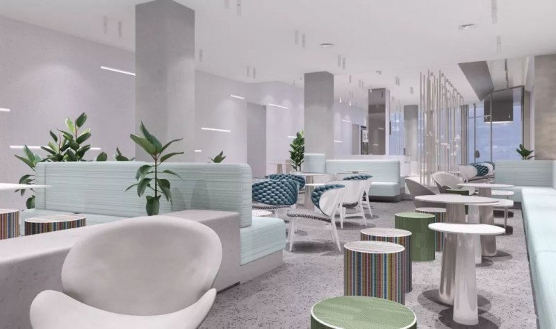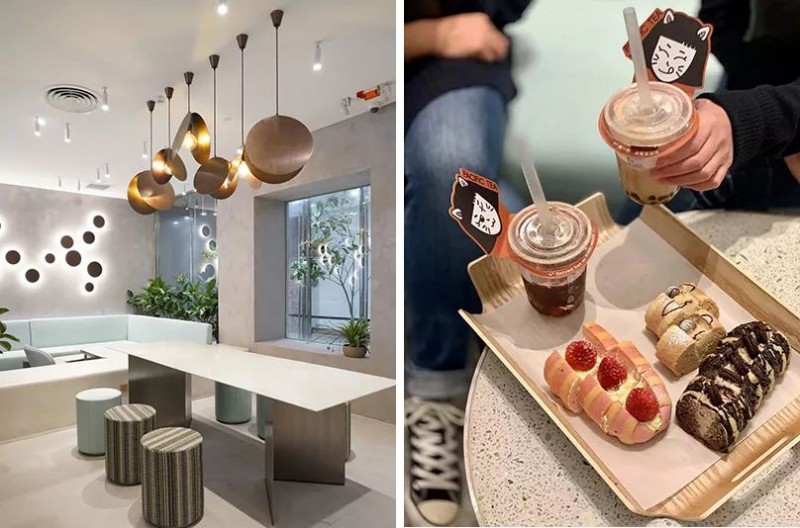 更多地偏向网红店既视感,素色的墙面有柔光点缀,有种INS风的淡绿色沙发座供客人等位。
