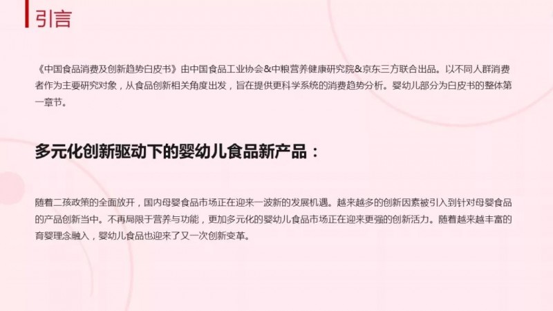 《白皮书》基于对京东大数据平台、食品工业协会专家团队以及中粮营养健康研究院消费者中心相关调研数据的分析,从食品市场发展和消费者需求洞察出发,关注食品行业新产品创新,深度剖析发展趋势。其中,近年来发展迅猛的婴幼儿食品市场备受关注。