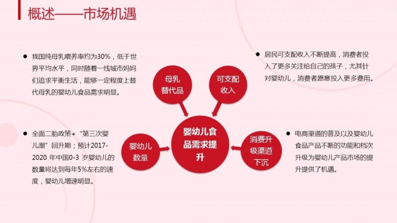 受二胎政策全面开放影响,中国婴幼儿数量未来几年有望持续增长,居民可支配收入不断提高,在电商渠道的普及以及消费品产品升级趋势影响下,消费者在婴幼儿食品上的消费也会势必会持续增加。这为婴幼儿食品市场的发展提供了更多机遇。