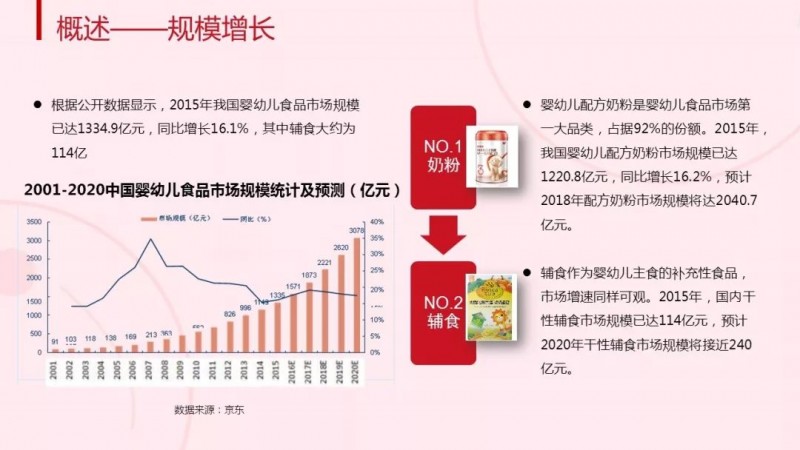 婴幼儿食品市场规模目前仍在持续扩大。公开数据显示,2015年我国婴幼儿食品市场规模已达1334.9亿元,同比增长16.1%,其中婴幼儿配方奶粉占据92%的份额,辅食市场规模约为114亿。白皮书数据表明,2018年配方奶粉市场规模将达2040.7亿元,干性辅食市场规模将接近240亿元。