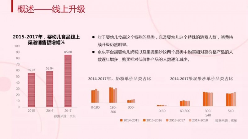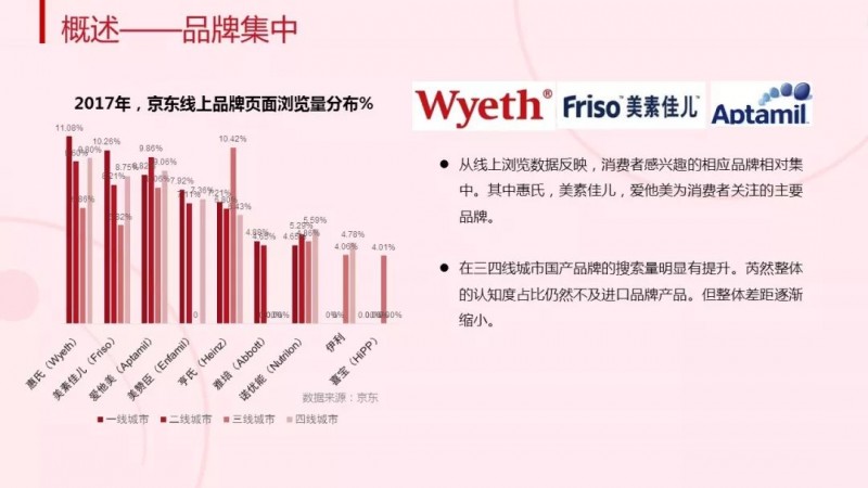 在婴幼儿食品的销售中,线上渠道十分受欢迎,销售额始终保持着高速增长,消费升级特征明显。根据《白皮书》数据显示,在京东商城中,婴幼儿奶粉以及果泥果沙两大品类中购买相对高价格产品的人数逐年增多,购买相对低价格产品的人数则逐年减少;从线上浏览数据来看,消费者感兴趣的品牌也相对集中,其中惠氏、美素佳儿、爱他美为消费者最关注的三大主要品牌。