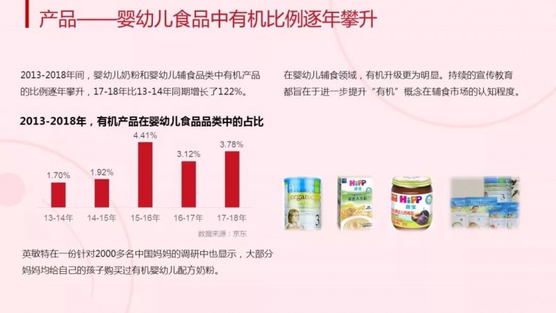一方面,有机概念获得了消费者的广泛接受,婴幼儿食品中“有机产品”的比例逐年攀升:2017-2018年,婴幼儿奶粉和婴幼儿辅食品类中有机产品的比例,比2013-2014年同期增长了122%。“有机”越来越成为消费者认可和选择的重要参考元素。