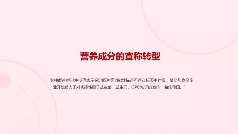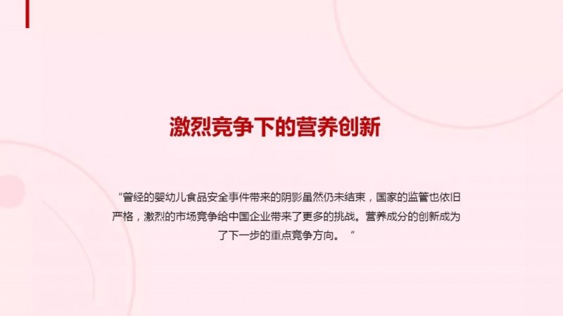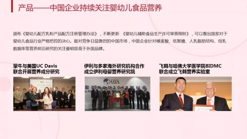 在激烈的市场竞争下,营养成分的创新正在成为婴幼儿品牌商重点的竞争方向:从行业动向来看,蒙牛、伊利以及飞鹤等中国乳制品大牌纷纷成立了营养成分研究所。同时,中国企业针对唾液酸、低聚糖、人乳脂肪结构、母乳数据库等营养前沿研究的关注度明显高于外国,相关法律法规一旦通过,必将会有大量的营养成分创新产品涌现。