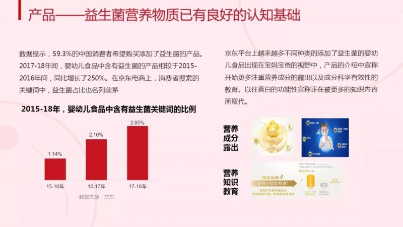 另一方面,消费者对于“益生菌”等营养物质逐渐形成了良好的认知基础,更愿意为含有“益生菌”的产品买单。京东数据显示,59.3%的中国消费者希望购买添加了“益生菌”的产品。2017-18年间,婴幼儿食品中含有益生菌的产品相较于2015-2016年间,同比增长了250%。消费者在京东商城平台上搜索的关键词中,“益生菌”占比也名列前茅。京东商城也为消费者呈现了越来越多的含有益生菌的婴幼儿食品。