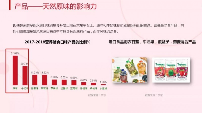 消费者对于辅食的口味要求,则依然以“原味”为主。随着辅食产品的不断开发,加入到宝宝食谱当中的新口味越来越多,但是妈妈们仍然更加喜欢原味辅食或牛奶味辅食。白皮书数据显示,在2017-2018营养辅食口味产品比例方面,原味和牛奶味占比高达31.89%和20.74%。