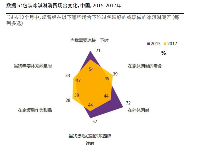 英敏特咨询在《2017中国冰淇淋报告》中,则更直接地指出了这种变化——2017年有近一半(49%)的中国城市消费者将冰淇淋当作是在家休闲时的零食,39%作为在家饭后的甜品——2015年这两个数字还分别只有39%和28%。而仅作为解暑功能的冰淇淋消费比例,则从71%大幅跌到现在的54%。