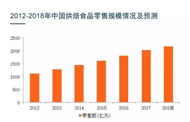 据统计,中国整个烘焙行业的市场空间一直被看好。2012-2017年年均复合增长率为12.8%。2017年,我国烘焙食品零售规模突破了2000亿元,预计2018年中国烘焙食品零售规模将近2170亿元。