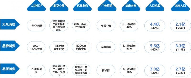 (2)三四线城市处于品牌化消费阶段,正向品质化消费进化,覆盖5.6亿人口,占总人口的40%;对应城市人口数3.3亿人,占城市人口的41%。