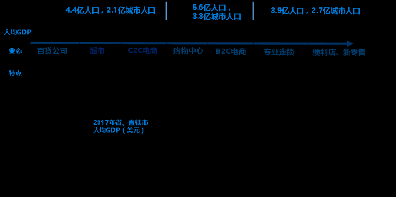 在收入比较低的阶段,消费者还处于大众消费阶段,对价格敏感性高,购买的品类也比较单一,百货、超市以及C2C电商会比较受欢迎。