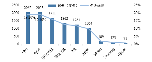 2018Q3中国智能手机市场销量占比最高为VIVO和OPPO,市场份额分别高达19.2%和19.1%,将苹果、三星等大品牌甩在身后。