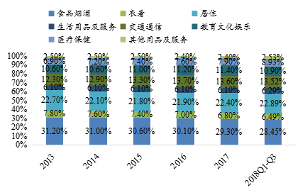 近年来,全国居民消费支出结构升级趋势明显,教育文化、交通通信、医疗保健支出占比提升,居住类支出占比高,分别从2013年的12.3%、10.6%、6.9%提升到2018Q1-Q3的13.5%、10.9%和8.9%。