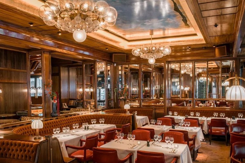 室内包含了古老与现代,镜子、灯饰、地面保存了历史,色调的明亮与内外的通透散发着现代感,与木质桌椅形成和谐的对比。