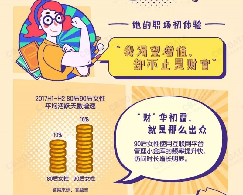 作为互联网原住民,90后女性在投资方面更擅长用互联网手段管理自己的小金库,CBNData《报告》发现,与80后女性相比,基于2017年下半年对比上半年,她们在互联网平台投资的活跃天数有更高的增速,访问时长增长明显。