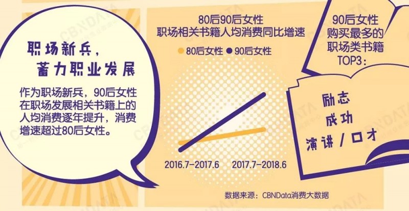 一方面,体现在提升职业能力的消费上,CBNData《报告》显示,90后女性在职场相关书籍中的人均投入逐年提升,虽然消费力与80后女性还存在差距,但增速更为迅猛,可见年轻女孩们职业发展的意识与需求非常强烈。