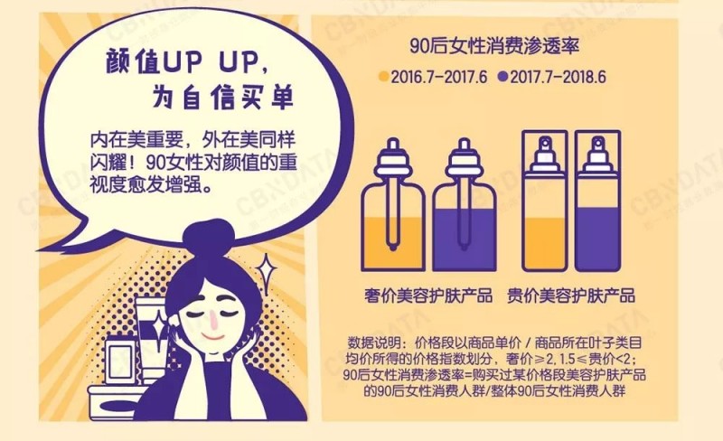 另一方面,能力提高的同时,外在美也不能落下,毕竟为颜值买单,也就是为自信买单。虽然90后少女们在购买力上不及80后前辈,但美容护肤产品人均消费保持高速增长。