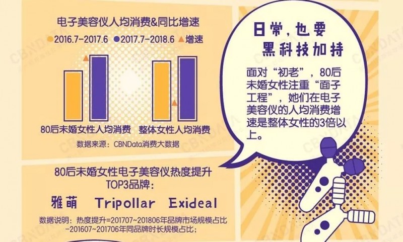 首先,80后未婚女性愿意砸钱在黑科技上来维护“脸面”。她们在“初老”面前的危机感高于整体女性,CBNData《报告》显示,80后未婚女性对于电子美容仪的人均消费增速是整体女性的3倍以上。日本品牌雅萌、Exideal,和以色列品牌Tripollar近两年热度提升显著。
