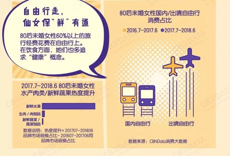 其次,是健康“尝鲜”追求,《报告》显示,80后未婚女性的饮食消费结构中,生鲜蔬果的比重逐年加深,零食的比重减少,健康饮食意识增强。两年间购买热度提升最快的品类是新鲜水果,肉制品和蔬菜,毕竟要照顾与年纪呈反比例函数的新陈代谢。