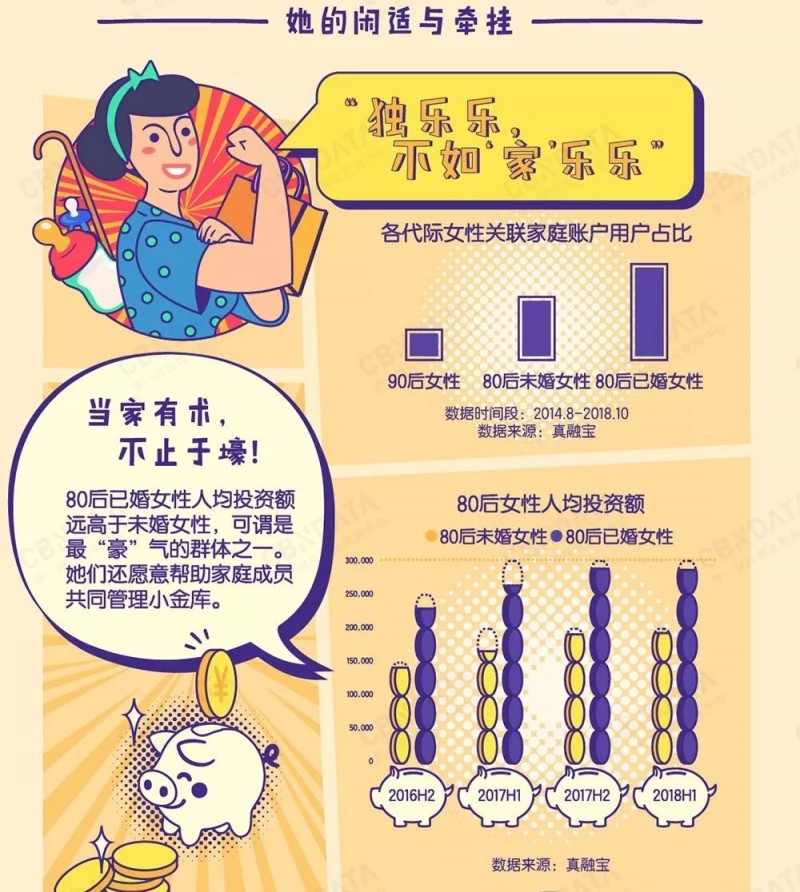 CBNData《报告》显示,80后已婚女性人均投资额、复购率均高于80后未婚女性。此外,比起保守稳健的80后未婚女性,80后已婚女性在投资中愿意承担更大的风险,追求更高的收益率,这一定程度上能够助力她们对家庭有更加悉心的呵护。她们也最愿意关联家庭账户,帮助家庭成员共同管理金库。