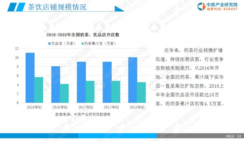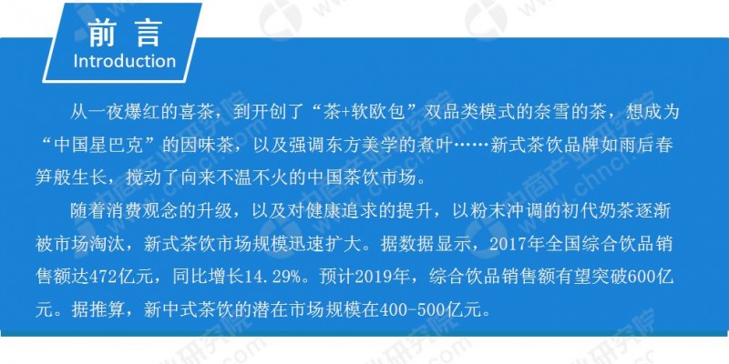 随着消费观念的升级,以及对健康追求的提升,以粉末冲调的初代奶茶逐渐被市场淘汰,新式茶饮市场规模迅速扩大。据数据显示,2017年全国综合饮品销售额达472亿元,同比增长14.29%。预计2019年,综合饮品销售额有望突破600亿元。据推算,新中式茶饮的潜在市场规模在400-500亿元。
