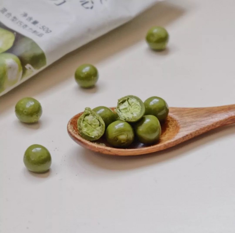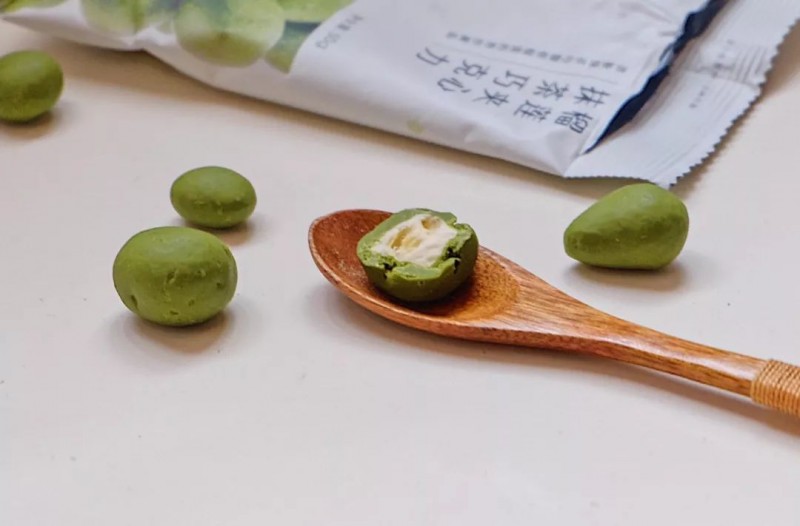 一颗颗会泛着绿光的“小珠子”,迷你可人,抹茶巧克力的涂层厚度还是很感人哒,夹心是碗豆干,让口感多了一份“咔吱咔吱”的酥脆感。
