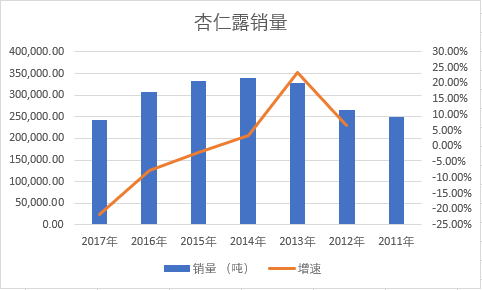 自2012年起,承德露露开始在年报中披露杏仁露销量信息。2014年起,其杏仁露产品销量增速大幅下滑,并于2015年开始负增长。2017年,其杏仁露产品销量仅24.1万吨,比2011年的销量还低。