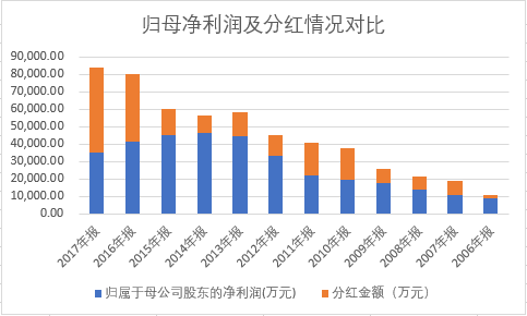 市界发现,业绩年年下滑,承德露露却非常热衷现金分红。自2006年起,承德露露几乎每年都拿出一半以上的利润进行分红。2006至2017年,公司累计实现归母净利润33.85亿元,累计分红20.05亿元。