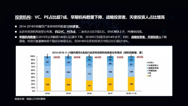 同样在餐饮投资机构当中,2014年到2018年,中国餐饮产业参投机构数量是1200多家,其中主要是以VC和PE为主,所占比例接近七成。