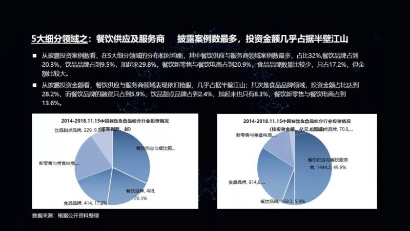 整个餐饮产业投融资的状况,我们把它分成了五个大类来进行分析:
