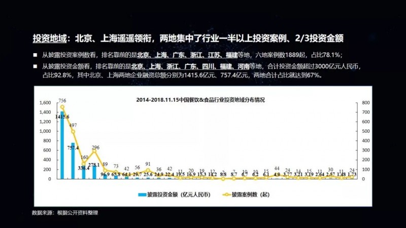 通过资金的流向,我们建议餐饮创业在北京、上海、广东、浙江等这几个省,这样更有机会拿到资本。