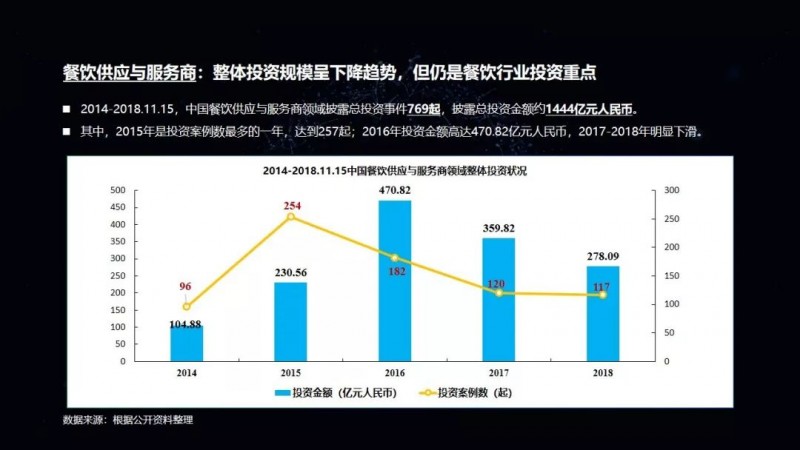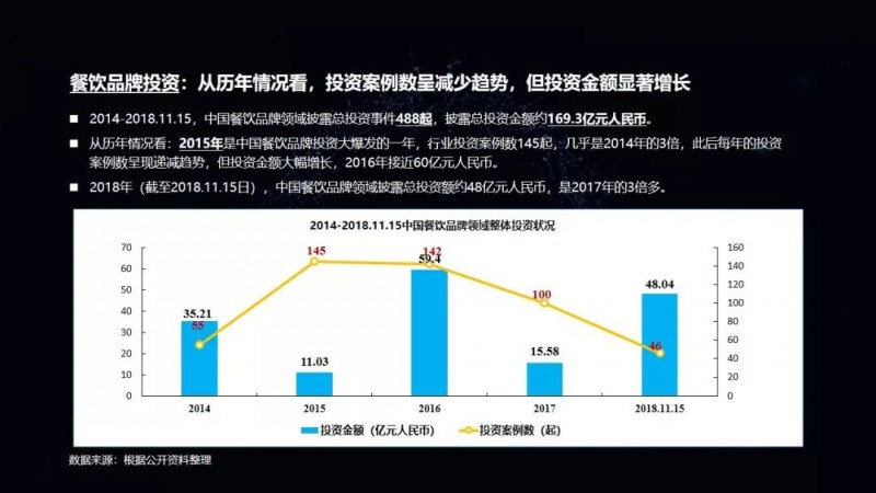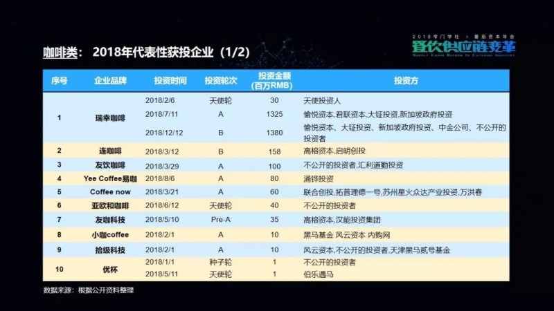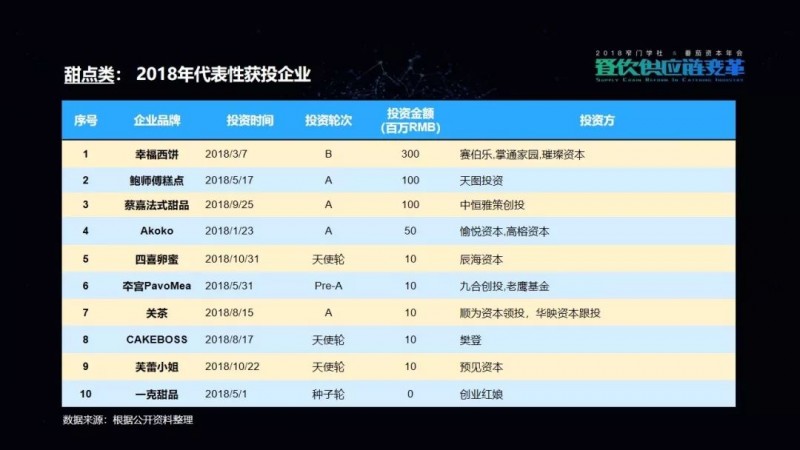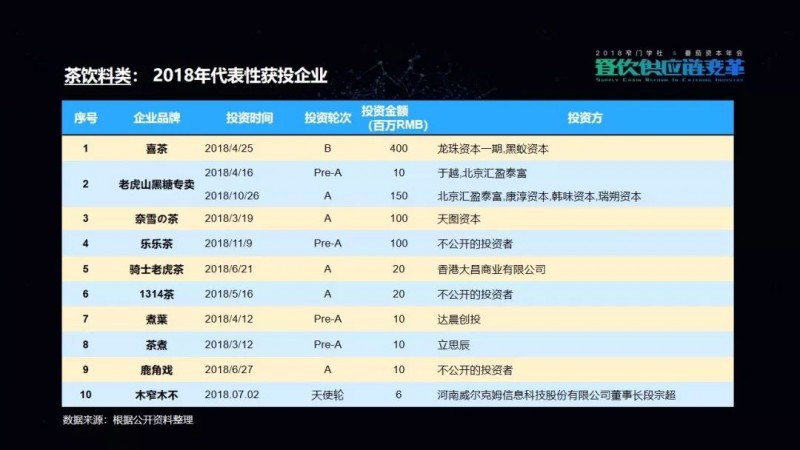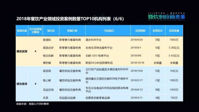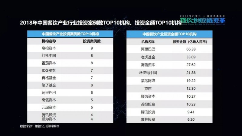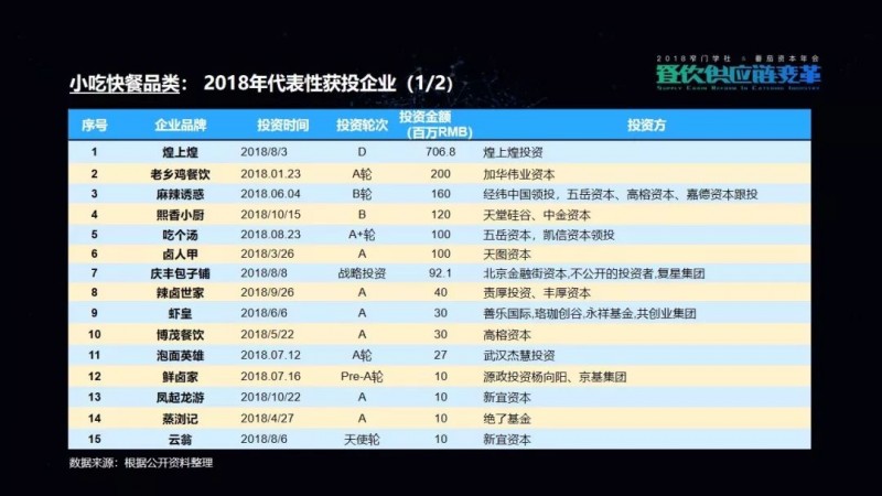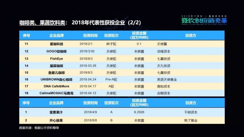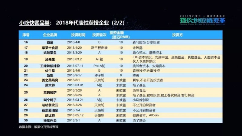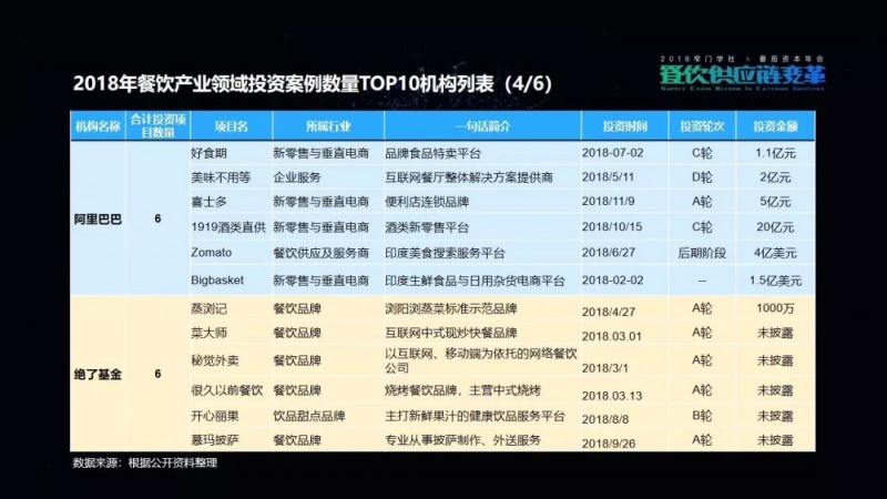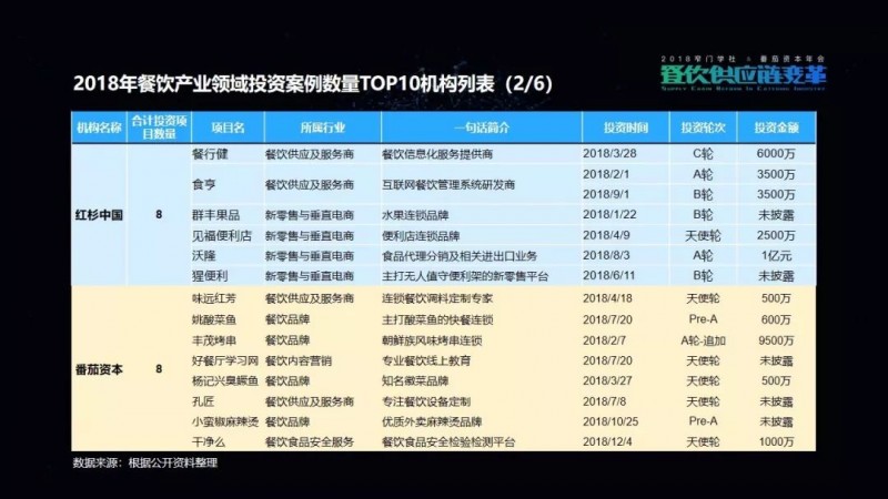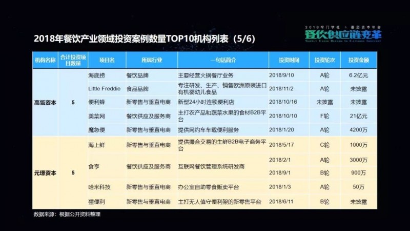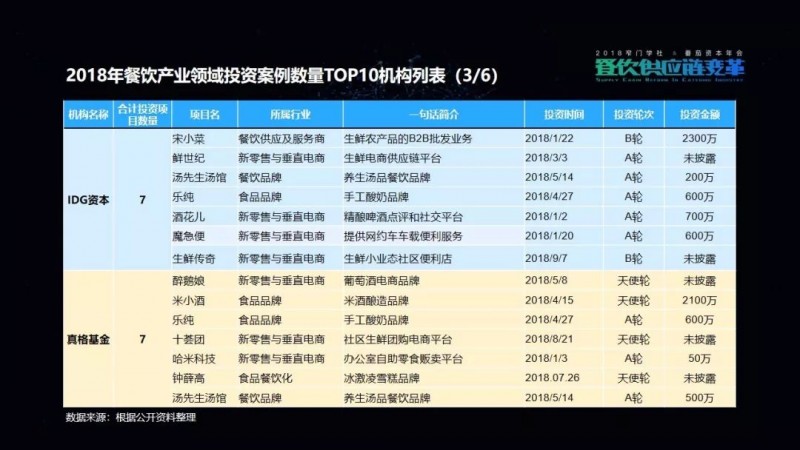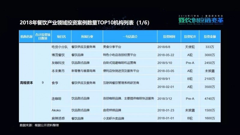 包括我们在这次的项目披露当中,可以看到有一家机构叫高榕资本,它在2018年的投资数量是最多的。但是它也已明确表示,在2019年将会减少对餐饮品牌的关注,转而更多地投向餐饮供应链项目。