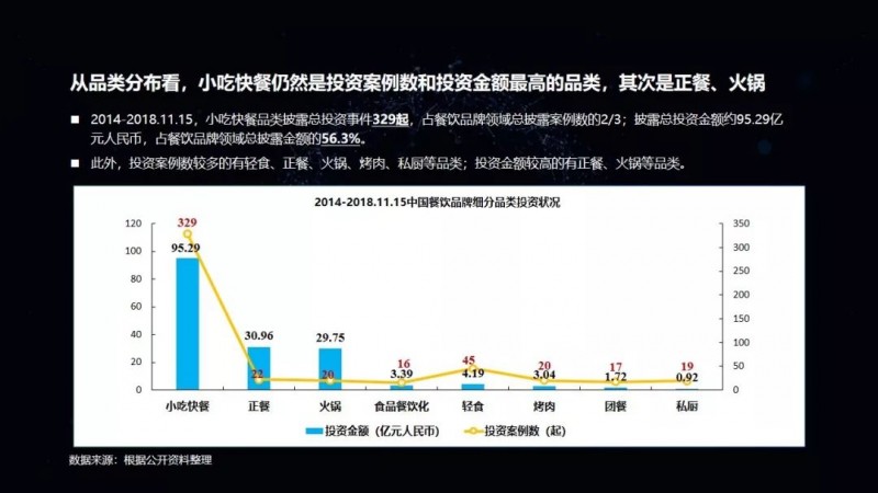 小吃在2014-2018年,总共有329起的投资事件,金额也高达95亿人民币。正餐是一个超大的品类,但整个正餐只有22起投资,而火锅这样一个单品类就包含20多个投资事件。