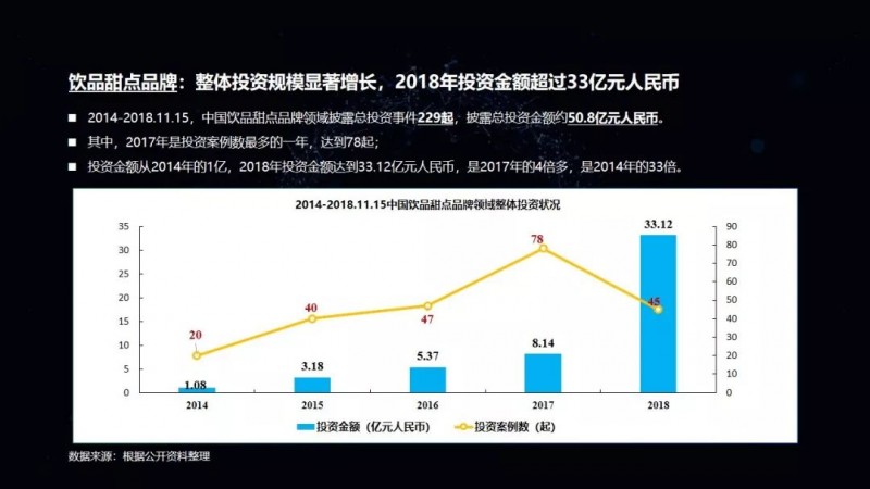饮品甜点品牌在2014年只有1个亿,2015年是3个亿,2016年15个亿,2017年是18个亿,到了2018年有33个亿,逐年都在递增。