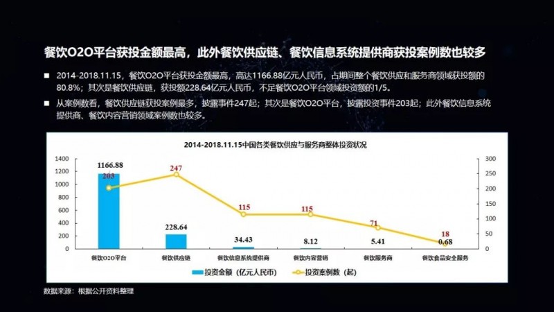 餐饮O2O平台获投金额最高,高达1166.88亿元人民币,占整个餐饮供应和服务商领域获投额的80.8%;其次是餐饮供应链,餐饮供应链获投案例最多,披露事件247起。